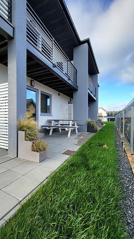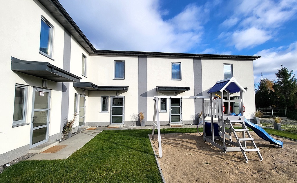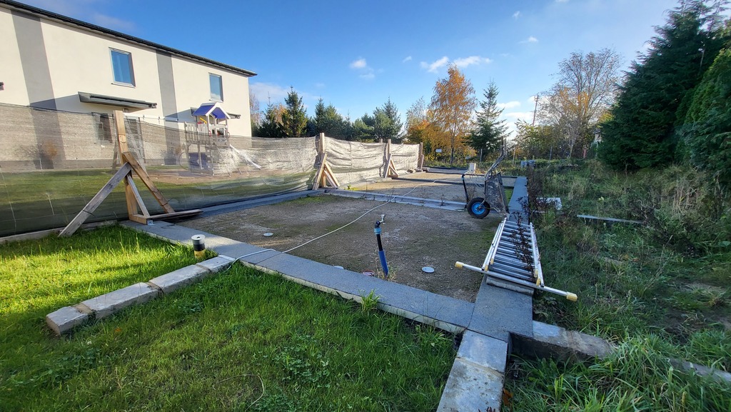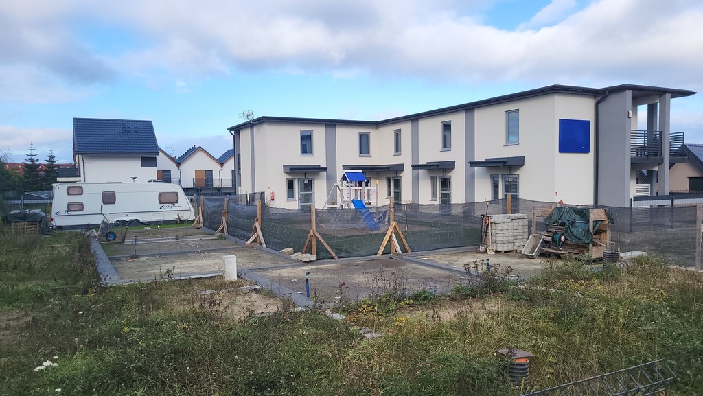 Dodatkowo istnieje możliwość postawienia drugiego bliźniaczego budynku – jest gotowy projekt ze wszystkimi pozwoleniami, wylane zostały fundamenty pod budowę, wyprowadzono wszystkie przyłącza. Teren wokół nienagannie zagospodarowany, przygotowany mały plac zabaw dla dzieci, wydzielony parking na 10 miejsc postojowych.