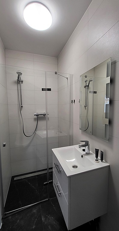 - Parter - salon z aneksem kuchennym, łazienka z toaletą i prysznicem oraz taras,