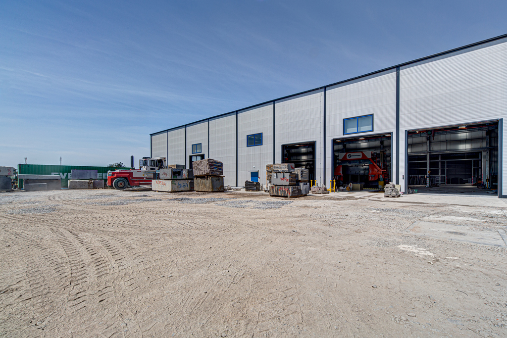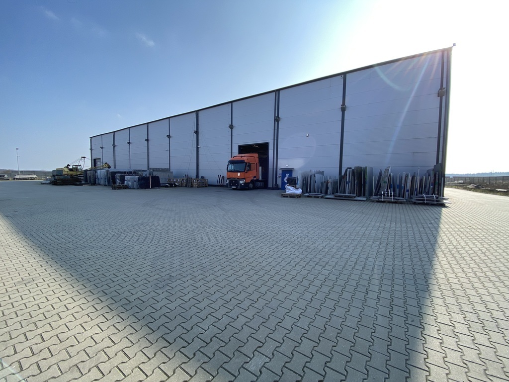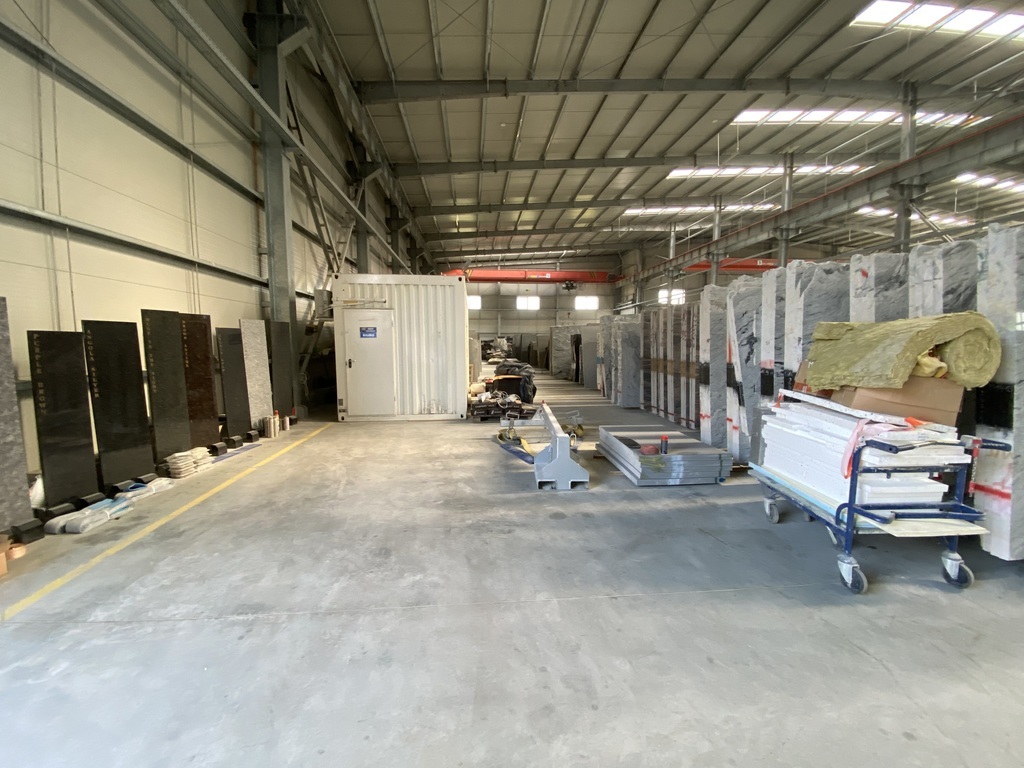 Hala produkcyjno-magazynowa o pow. użytkowej 3354,85 m2 jest podzielona na 3 części - magazyn płyt, hala obróbki i hala cięcia bloków. W obiekcie znajduje się dodatkowo część socjalna, w skład której wchodzą: pomieszczenie gospodarcze, szatnia z jadalnią, prysznic, 2 WC oraz przedsionki. Budynek wyposażony jest w 2 bramy o wymiarach 5 m x 5 m oraz 6 bram o wymiarach 4 m x 5 m (szerokość x wysokość) z dostępem z poziomu "0". Posadzka z płyty betonowej o grubości od 20 do 25 cm. Obiekt wykonany w technologii szkieletu stalowego pokrytego płytami warstwowymi ocynkowanymi. Dach dwuspadowy pokryty płytą trapezową warstwową. Wysokość hali wynosi ok. 12 m.