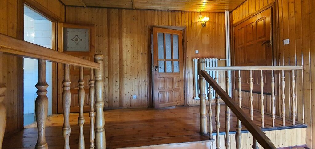 - na piętrze były dwa bardzo duże pokoje (45 m2 z wyjściem na taras oraz 16 m2), łazienka – pokój kąpielowy (12 m2) oraz korytarz i klatka schodowa. Pokój kąpielowy z wanną, umywalką, WC, bidetem - w glazurze i terakocie. Na tym poziomie jest także wyjście na taras z korytarza.