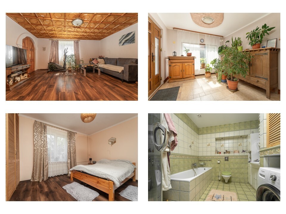 4. Dom mieszkalny dwupiętrowy z podpiwniczeniem oraz funcjonalnym układem pozwalającym na wynajem części pokojów. Na parterze znajduje się pokój dzienny wspólny, z którego możemy przejść do części mieszkalnej właściciela, która składa się z własnego salonu, sypialni, gabinetu, łazienki i kuchni, z dodatkowym prywatnym wejściem z drugiej strony budynku. Ze wspólnego pokoju dziennego prowadzą też schody na piętro, gdzie znajdziemy kolejne 4 pokoje z łazienkami.