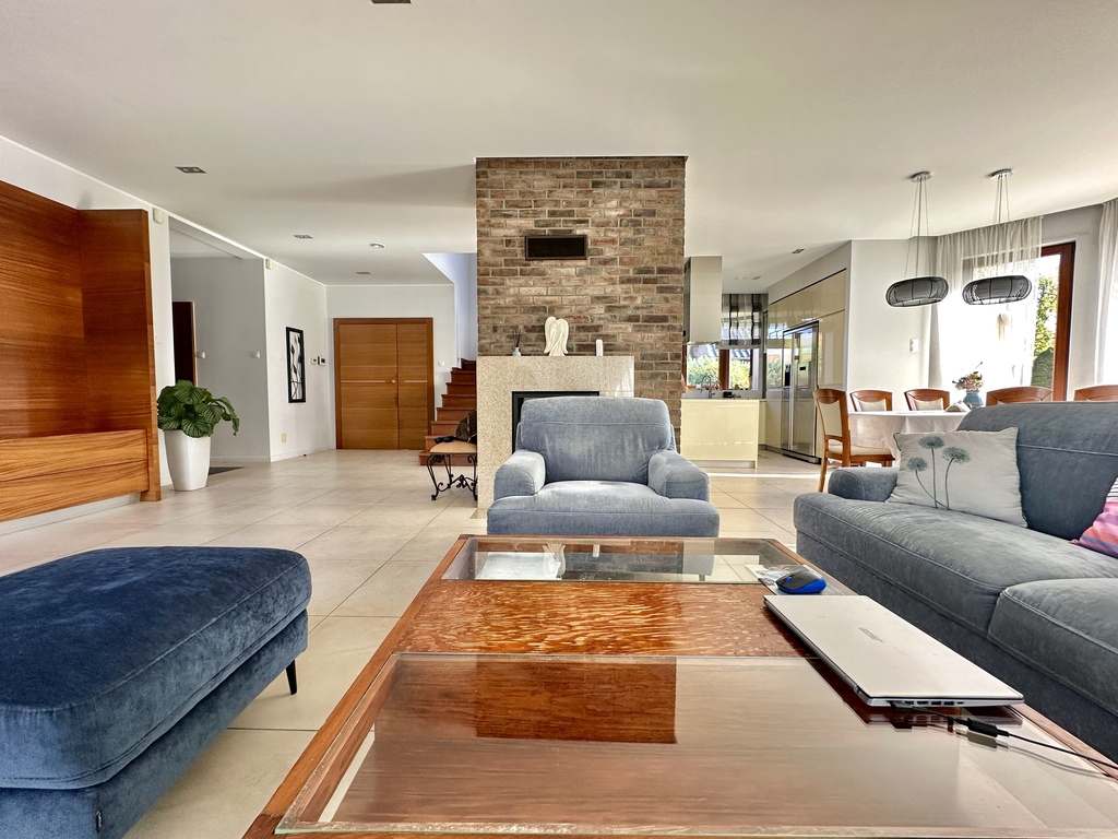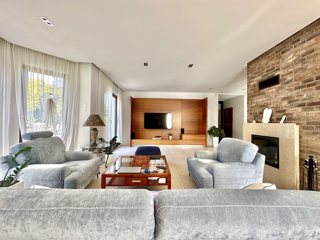 • przestronny salon z kominkiem z płaszczem wodnym i wyjściem na taras (ok. 35 m², kafle mrozoodporne),