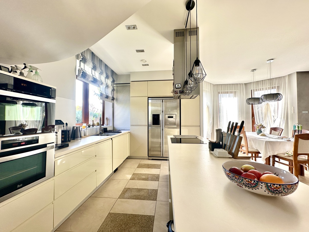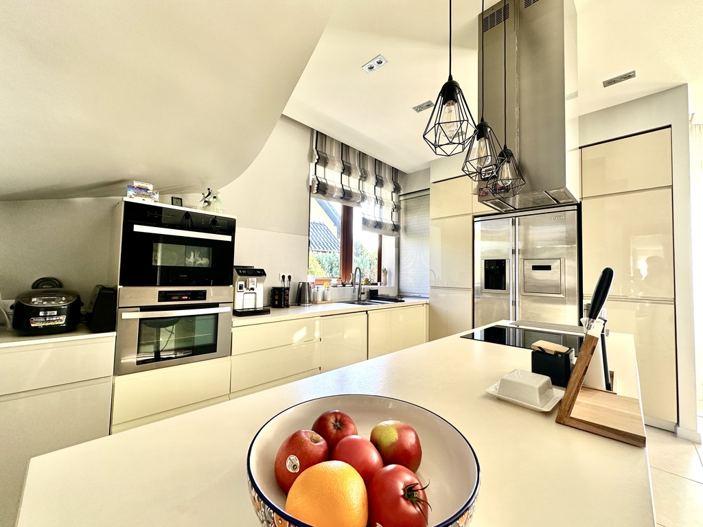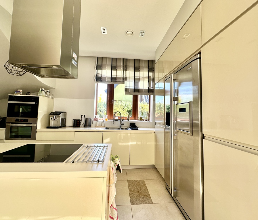• otwarta kuchnia z oknem, pełna zabudowa meblowa oraz sprzęt AGD (płyta indukcyjna, piekarnik, mikrofala, lodówka side-by-side z kostkarką, krajalnica i inne),
