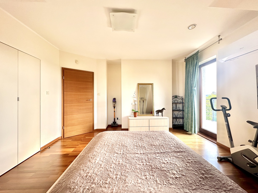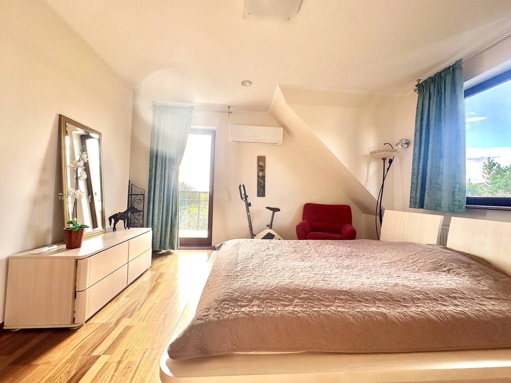 • sypialnia główna z garderobą i balkonem z widokiem na tereny zielone,