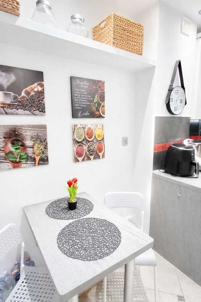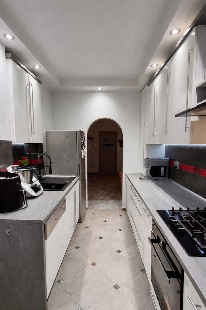 Kuchnia (ok. 10 m²) – wygodna, w pełni wyposażona, z meblami na wymiar i sprzętem AGD, z miejscem na stół